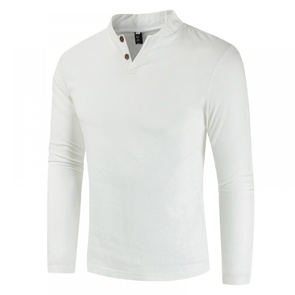 Men's Cotton and Linen Long-Sleeved Pullover Fashion Urban Unhooded Stand-Up Collar Men's T-Shirt